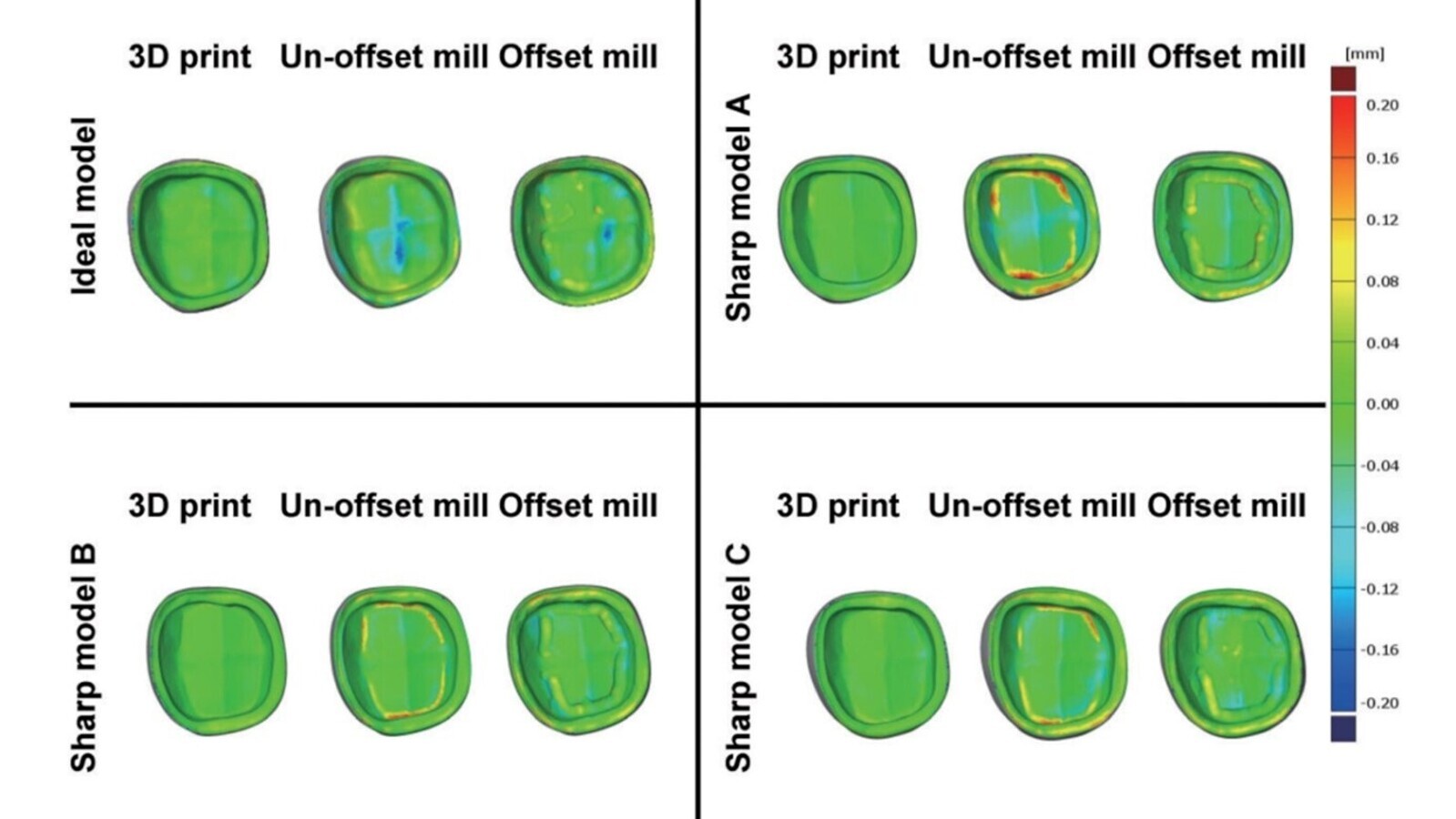 Vergeleken met de gefreesde kronen die tijdens het onderzoek werden vervaardigd, waren de DLP-geprinte kronen systematisch nauwkeuriger en hadden ze minder marginale afwijkingen. De onderzoekers merken op dat, vooral bij de kroonknobbels, de gefreesde kronen een hogere mate van dimensionale afwijkingen hadden en dat het aanbrengen van correcties op de interne oppervlakken van de gefreesde producten die afwijkingen hadden, resulteerde in groeven.