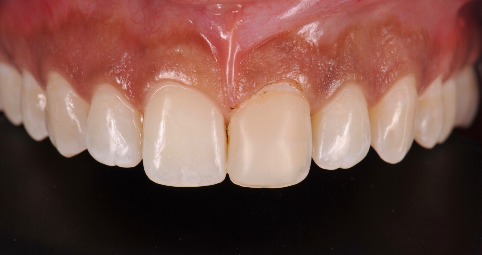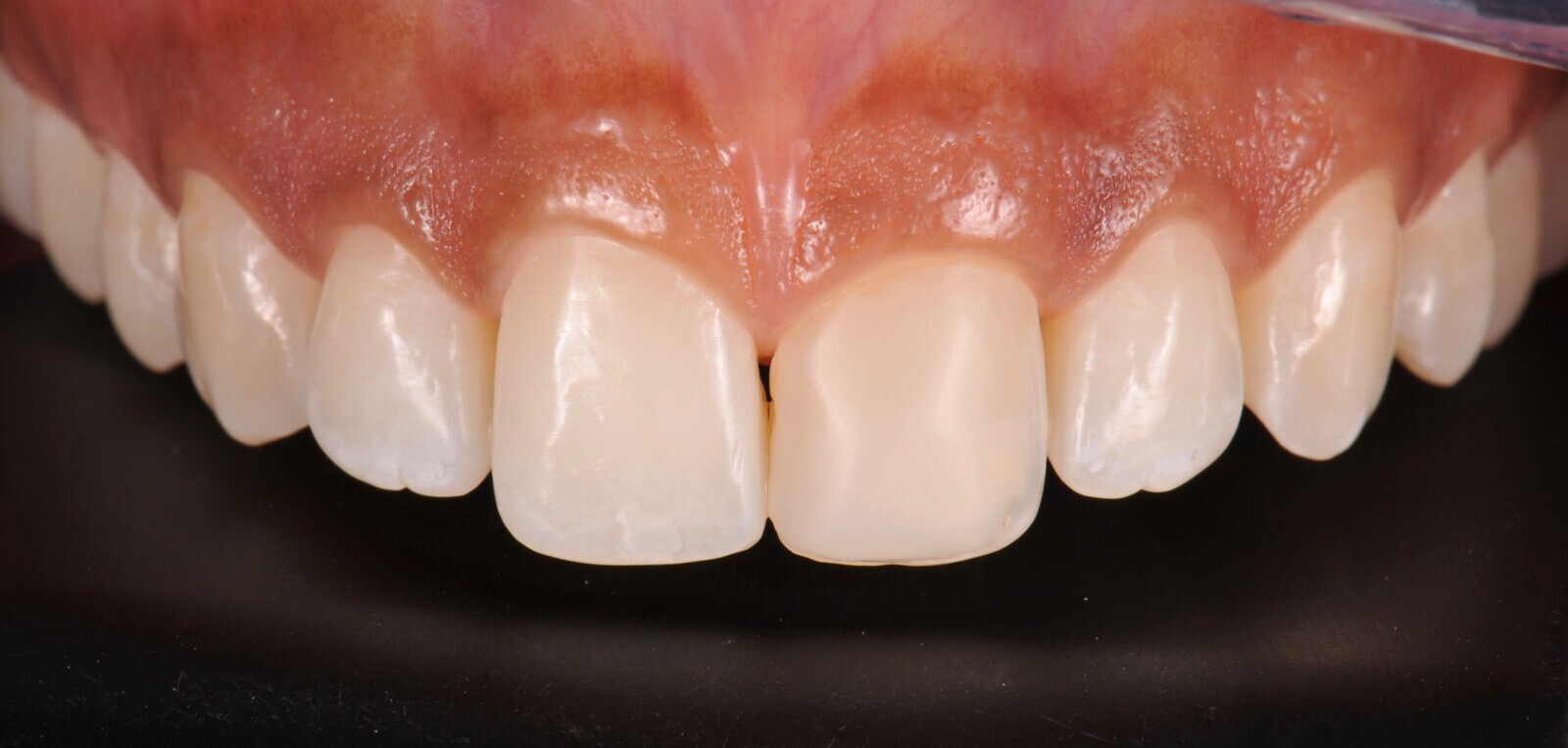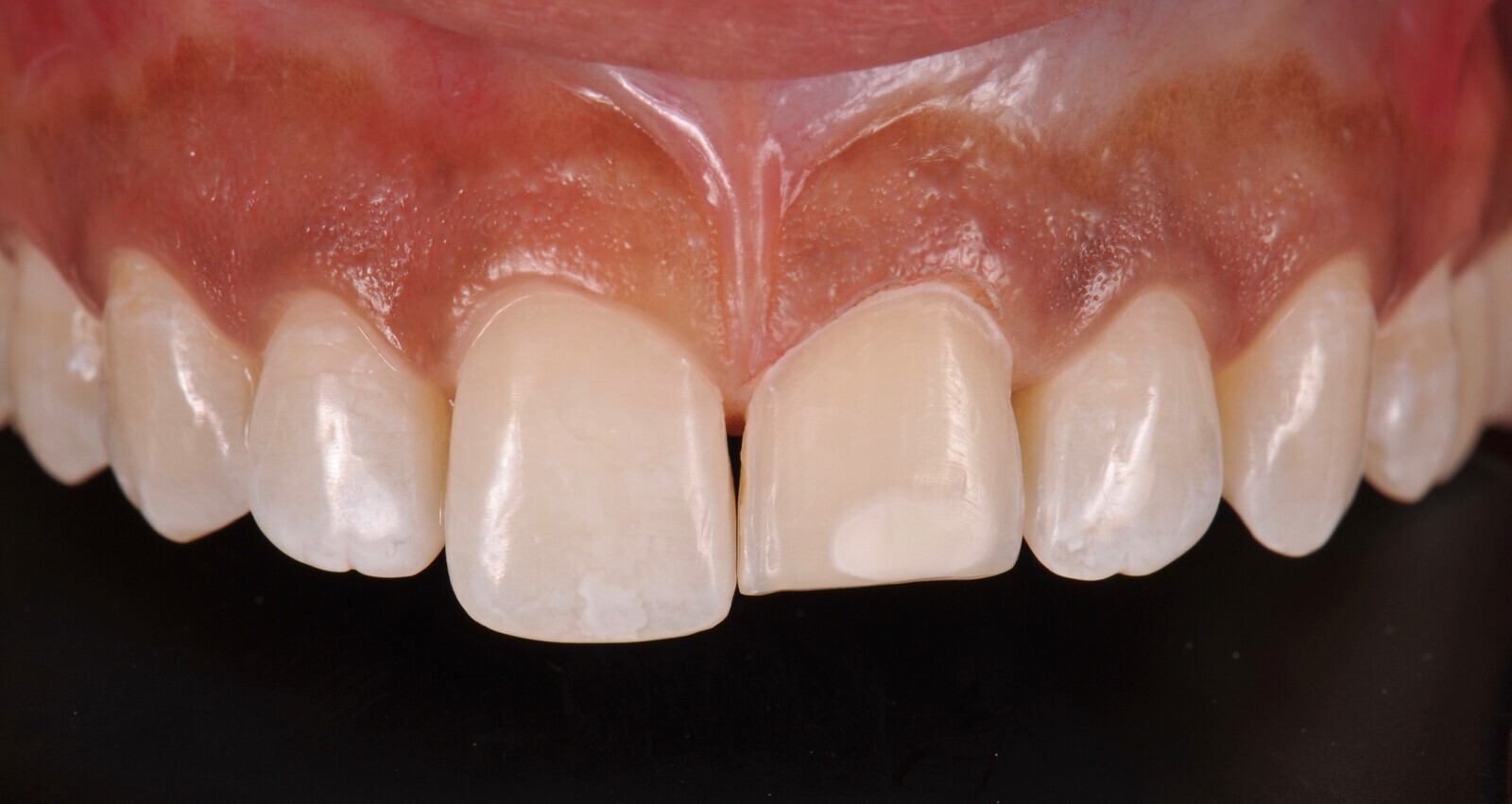 Vaak kan een verkleurde voortand minimaal invasief behandeld worden, door het element extern (vitaal) of intern (avitaal) te bleken. Soms is de verkleurde voortand echter al in een eerdere fase gerestaureerd en is opnieuw restauratief ingrijpen noodzakelijk om de esthetiek te verbeteren. In deze casus gaat het om een jonge vrouw met een hoge lachlijn die zich stoorde aan deze donker verkleurde 21. Het element is vitaal, geoblitereerd en in het verleden al eens met composiet gerestaureerd. Gezien haar prachtige verdere dentitie en hoge esthetische verwachtingen heb ik in dit geval gekozen voor herbehandeling met een adhesieve keramische restauratie.
