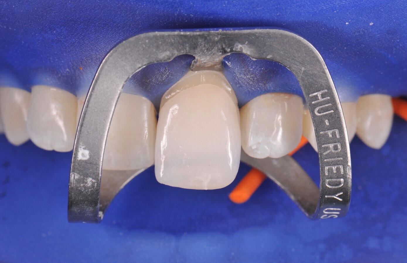 5. De restauratie van buccaal opgebakken lithiumdisilicaat wordt onder rubberdam geplaatst voor optimale controle over het adhesieve proces.