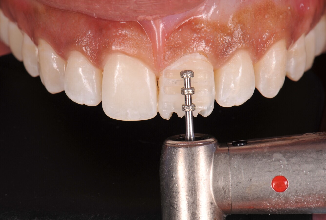 3. Om een gelijkmatige dikte van 0,5 mm te verkrijgen over het gehele oppervlak wordt de preparatie buccaal gestart met deze deptcutter. Vooraf zijn er rillen van 1,5 mm incisaal geslepen om de keramist daar straks voldoende ruimte te geven voor het aanbrengen van mamelons en incisale transparantie.