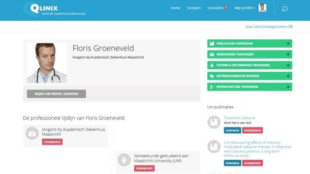 Daarop ontstond het idee voor Qlinix. “Veel netwerksites richten zich sterk op het sociale aspect, en de informatie op een social network is vaak vluchtig en niet inhoudelijk. Onze focus ligt juist op relevante vakinformatie. Bij Qlinix willen we mensen informatie bieden met een hoge attentiewaarde.” Vandaar de mogelijkheid om publicaties, zoals wetenschappelijke artikelen of voordrachten op congressen, te delen op het profiel, en het mogelijk te maken om collega’s te consulteren. Bovendien onderscheidt Qlinix niet alleen de grote vakgebieden, maar staat ook toe dat professionals specifieke expertise invullen, bijvoorbeeld ‘vergroeiingen in het kaakbot’.