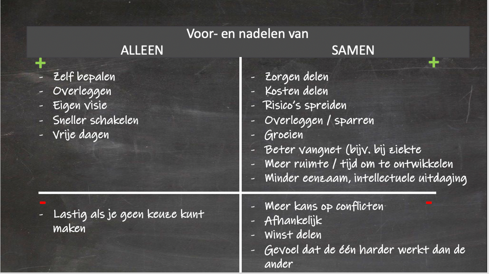 Het nadeel van de ene keuze is vaak het voordeel van de andere keuze. Als je alleen start, is het goed om na te denken hoe je de voordelen van samen starten alleen ook kunt bereiken. In het bedrijfsleven spreek je dan mitigerende maatregelen. De voordelen van samenwerken moet je zien op te vangen. Het goede nieuws is dat dat bijna altijd mogelijk is. Vice versa moet je naar jouw voordelen van alleen werken kijken als je samen gaat starten.