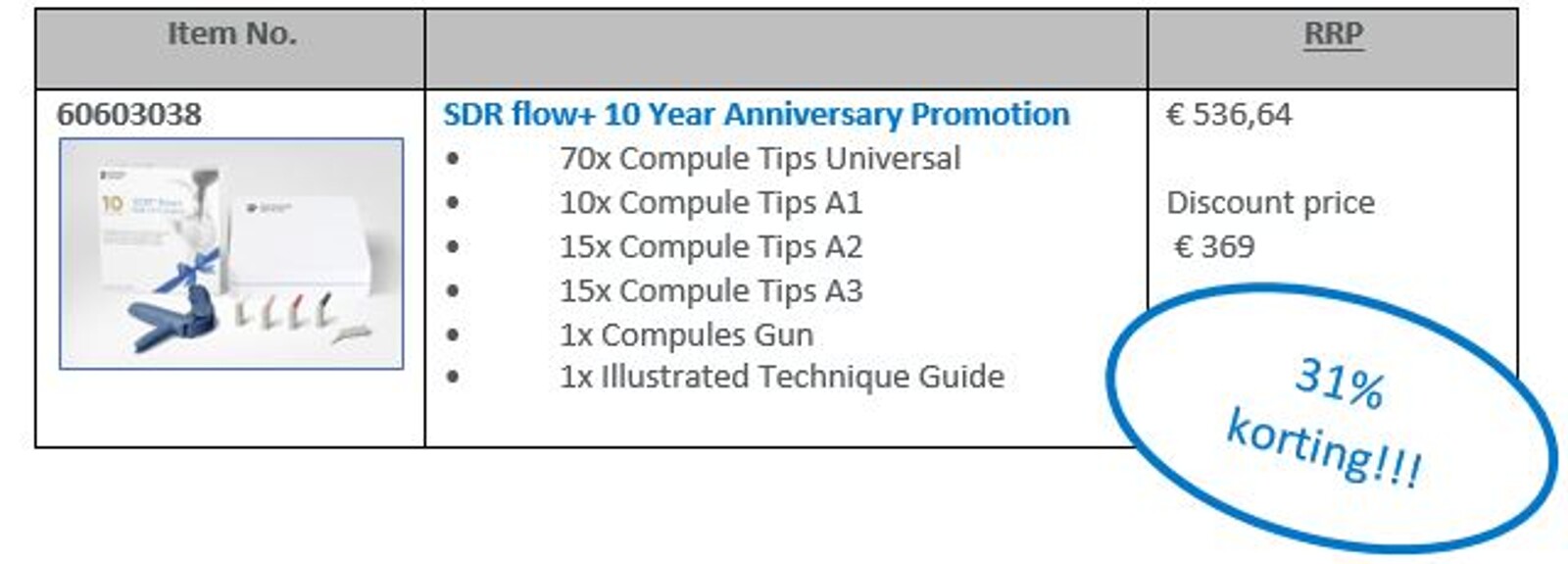 SDR® is de wereldwijde marktleider voor bulkvulling van posterieure restauraties. De stressverlagende SDR® technologie biedt 4 mm bulkvulmateriaal in vloeibare consistentie voor een uitstekende hechting en zelfnivellering en kent nog steeds zijn gelijke niet binnen de categorie van het bulkvulmateriaal. Na vele succesvolle, klinische studieresultaten heeft SDR® keer op keer bewezen dat het de vervaardiging van betrouwbare klasse I- en II- restauraties sneller en eenvoudiger maakt. Bovendien maken de eigenschappen van SDR® het ideaal voor verschillende andere indicaties, zoals de behandeling van primaire, posterieure dentitie, afsluiting van pits en fissuren, post-endodontische restauraties en zelfs stompopbouw.