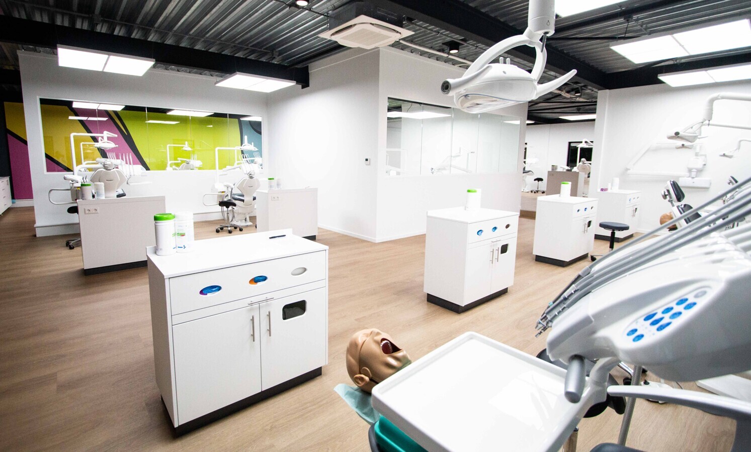 Het resultaat mag er zijn: de praktijkzaal is inderdaad het pronkstuk van de nieuwe locatie van Edin, met maar liefst zestien volledig uitgeruste behandelunits die met veel tussenruimte zijn opgesteld. Geclusterd, zodat verschillende groepen tegelijk praktijkonderwijs kunnen krijgen. Daarnaast zijn er een grote sterilisatieruimte, airflow-apparatuur, een opt-röntgenapparaat, et cetera. Van Riet: “Het is een behandelruimte met alles erop en eraan en volledig up-to-date. Als zich hier ooit een mondzorgpraktijk wil vestigen, zou die er zo kunnen intrekken.”
