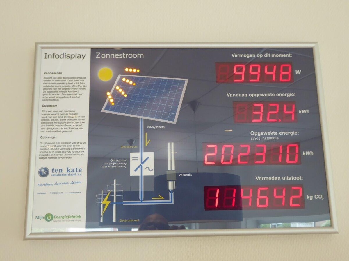 Bij binnenkomst in de wachtruimte van tandartspraktijk Wiersema springt direct een led-paneel in het oog. ‘Infodisplay zonnestroom’, staat er. Het bevat uitleg over de honderd zonnepanelen die op het dak van de praktijk liggen en geeft een actuele stand van de energie die ze opleveren. Ook kun je aflezen hoeveel uitstoot de zonnepanelen tot nu toe hebben voorkomen: bijna 115 duizend kilo CO2.