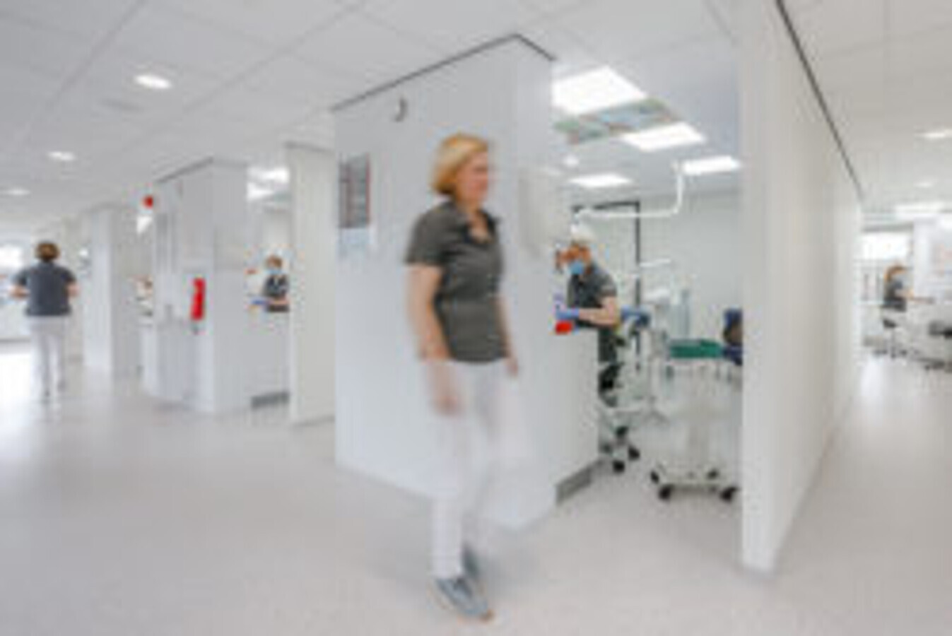 Zo grootschalig en geavanceerd als de praktijk is, bij binnenkomst valt de prejury iets anders op: rust. Druk is het in de wachtkamer nooit, want er wordt strak op tijd gewerkt. Voor tandarts-eigenaar Hans Brummelhuis is dat essentieel. “De tijd van de patiënt is voor ons even belangrijk als die van de behandelaar,” vertelt hij. In de ordelijke behandelkamers zorgt de open opzet voor veel licht en een ruimtelijk gevoel. Ook de consistente kleurstelling oranje-wit-grijs draagt daaraan bij. Het welzijn van medewerker én patiënt stond dan ook centraal bij de verbouwing.