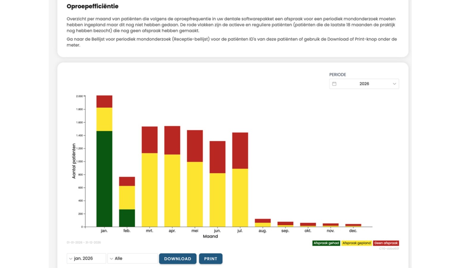 Uit onderstaande afbeelding blijkt dat 30 procent van de patiënten die een afspraak voor een periodiek mondonderzoek had moeten krijgen, deze niet heeft (de rode vlakken). Blijkbaar liep een aanzienlijk deel van onze patiënten toch door of belde later de afspraak af. We hebben het periodiek mondonderzoek natuurlijk niet voor niets, dus 30 procent ongepland is best veel. Deze patiënten zie je later terug met een behandelachterstand voor de mondhygiënist of tandarts, of in een vervelender geval met een spoedklacht.