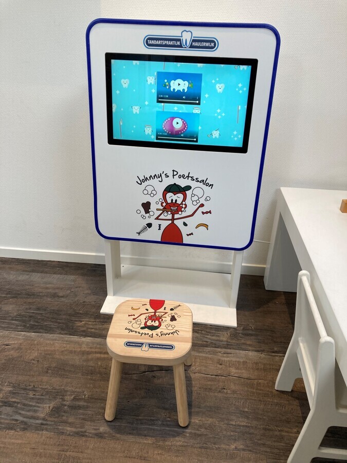 Wanneer je Tandartspraktijk Haulerwijk in het Friese Haulerwijk binnenloopt, is Johnny de aap direct zichtbaar in de wachtkamer. Het is een van de ongeveer honderd praktijken die Johnny Joker inzetten. Een kindje vermaakt zich bij het scherm van ‘Johnny’s poetssalon.’ Haar Johnny Joker-map ligt klaar voor een afspraak met de preventieassistent.
