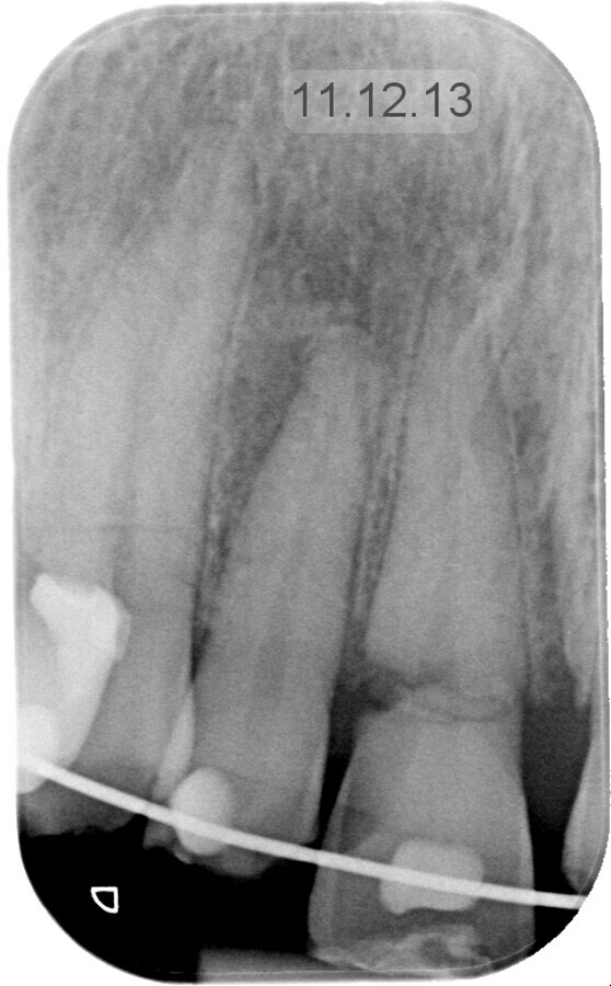 Tandfilm van de situatie kort na het ongeval. De 12 is gereponeerd en gespalkt. De kroon van de afgebroken 11 is om esthetische redenen aan de spalk gefixeerd. Tevens is de radixfractuur van de 13 zichtbaar