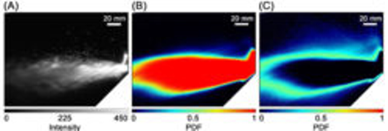 Afbeeldingen van “de door een onbelemmerde luchtturbine gevormde nevel die in een stabiele toestand draait (A), de kansverdeling van de concentratie van de sproeidruppels op basis van >2000 beelden (B) en zijn standaarddeviatie (C). Ter interpretatie in (B), de rode pixels duiden op een kans van 100% om op enig moment een druppel tegen te komen, bij zwarte pixels 0%. In (C) wordt de standaarddeviatie op een equivalente schaal uitgezet.” (Afbeelding: Imperial College London / King’s College London)
