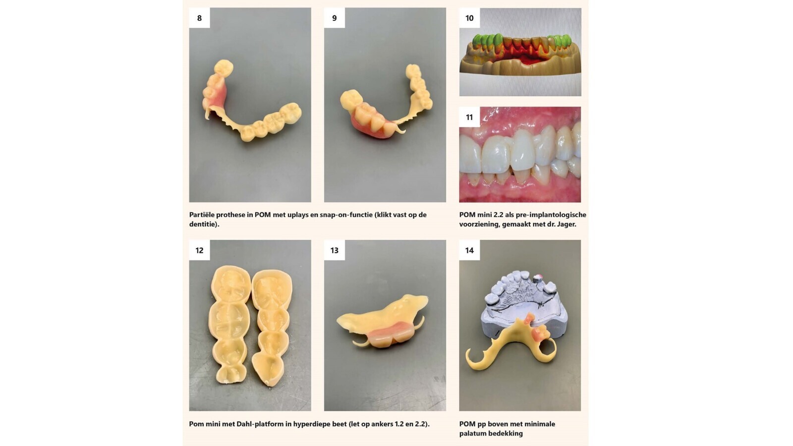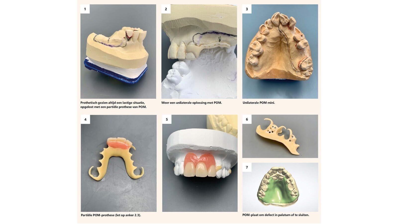 Daarna de POM-partiële prothese uitgevoerd met een Dahl-plateau of met POM-uplays om de beet te verhogen; het klassieke uplay-frame zoals u dat kent maar dan nu zonder metaal en zonder ankers en in POM uitgevoerd, een telescoopbrug in POM als meerjarige semipermanente voorziening, een palatinale POM-plaat in een 100% complete dentitie om een defect af te sluiten dat in het palatum was ontstaan (door cocaïnegebruik), voor de edentate maxilla een palatinale plaat gemaakt van POM in plaats van een volledig metalen plaat om een sterke en hyperdunne prothese te maken (plaat 0,7 mm dik!).