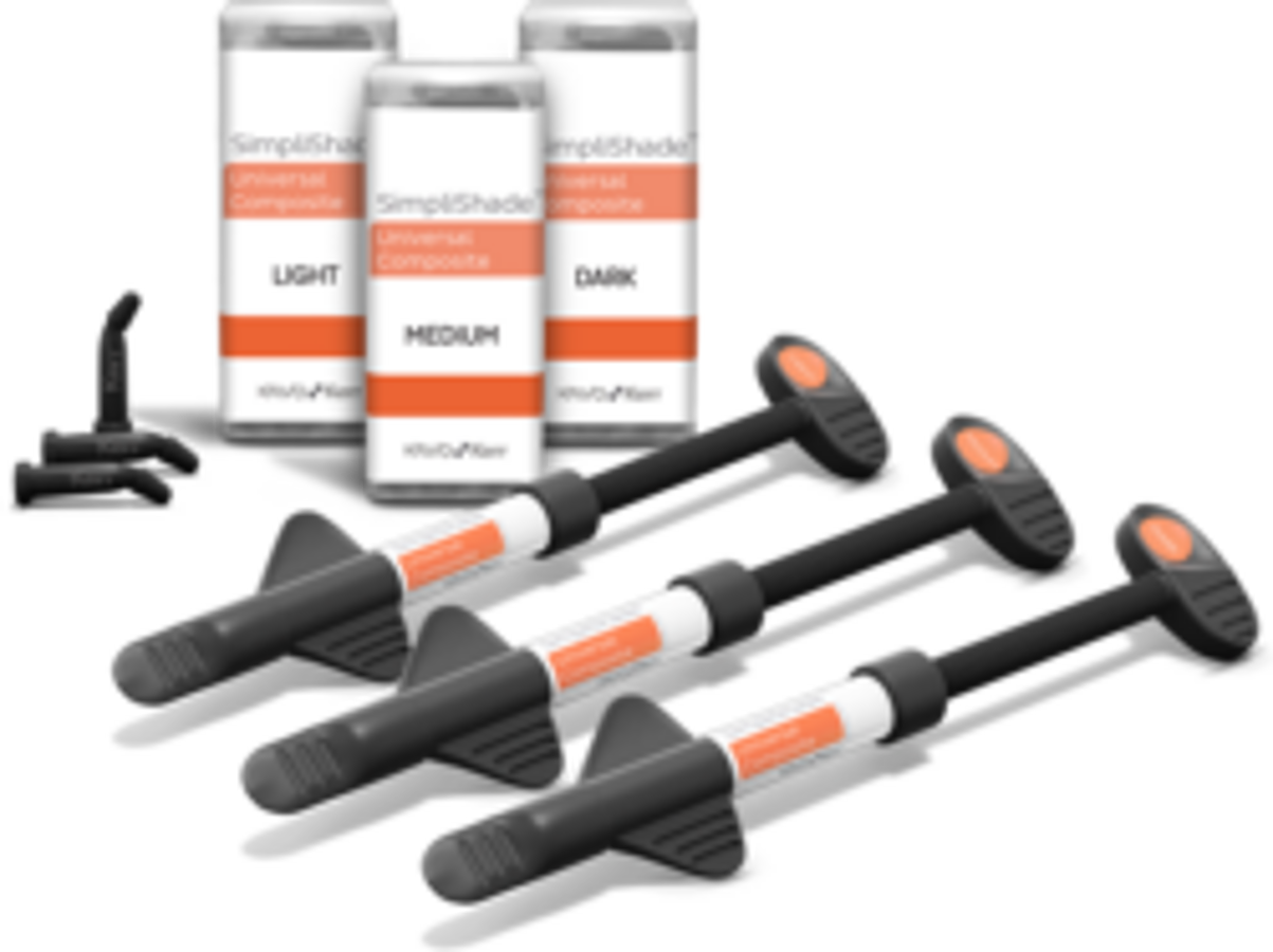 SimpliShadetm is het universele composietsysteem van Kerr dat met slechts 3 kleuren (light, medium en dark) alle klassieke 16 VITA tinten dekt. Dankzij de hoge vulgraad (81%) van het Adaptive Response Technologie (ART) filler netwerk, realiseert u zeer sterke restauraties die ook op langere termijn een betere weerstand hebben tegen chipping en breuk. Simplishades kleinere deeltjesgrootte (50nm) zorgt voor een betere polijstbaarheid en het vermogen om glans en schittering langer te behouden, zodat uw restauraties lange tijd een ongeëvenaarde esthetische uitstraling zullen hebben. De opaciteit van SimpliShade is ideaal om tandstructuren na te bootsen, onderliggende vlekken beter te maskeren en om goed te integreren met de kleur van de omliggende elementen (kameleoneffect). U kunt SimpliShade met vertrouwen gebruiken voor alle caviteitsklassen, zonder dat een blocker noodzakelijk is.
