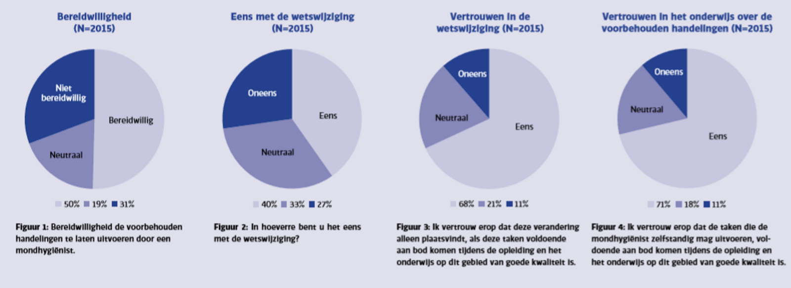 De helft (50,4%) van de participanten is bereidwillig de drie voorbehouden handelingen te laten uitvoeren door mondhygiënisten. Verder blijkt dat participanten het eens zijn met de wetwijziging en dat het vertrouwen in de kwaliteit van opleiding van de mondhygiënist met betrekking tot de voorbehouden handelingen grotendeels positief is.