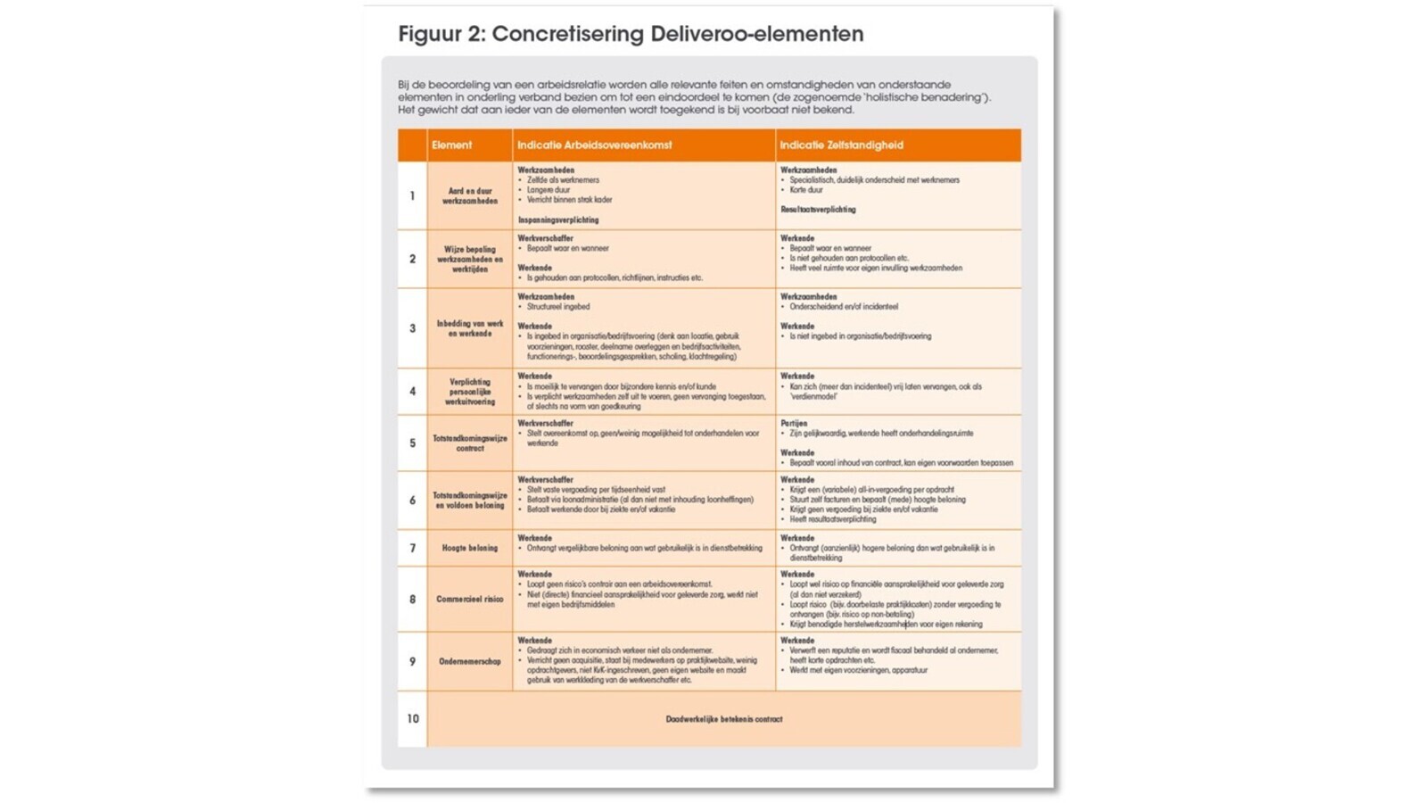 Het antwoord van de Hoge Raad is normstellend voor de rechtspraak in ons land. In de pers en op sociale media werd het dan ook als baanbrekend gepresenteerd. Maar eigenlijk is niet veel meer dan een bevestiging van de eerdere Deliveroo-uitspraak die ook al nadrukkelijk uitging van de holistische benadering en waarin het externe ondernemerschap een volwaardige rol toebedeeld kreeg. In de handhaving en rechtspraak is ‘Deliveroo’ sindsdien de norm voor de kwalificatie van een arbeidsrelatie (loondienst of zelfstandig?). Welke negen elementen deel uitmaken van het ‘Deliveroo-beoordelingsschema’ is te zien in figuur 2, met bij ieder element een korte uitleg vanuit het perspectief van de zorgsector.